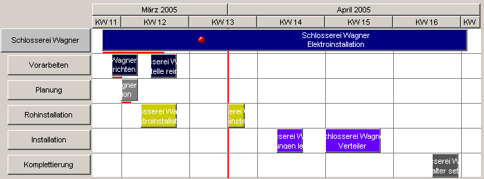 Der rote kleine Balken unter dem Termin entspricht den zugebuchten Stunden im Verhältnis zu den geplanten Stunden. Wenn der Balken also bis zur Mitte eines Termins geht, dann sind 50% der geplanten Stunden bereits erbracht worden.