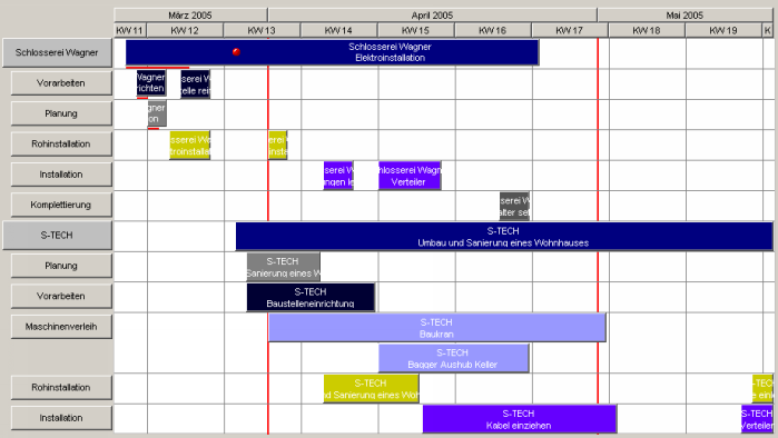 Auf diese Weise sind Sie in der Lage Baustellen übersichtlich in chronologischer Reihenfolge darzustellen. Dieses Beispiel ist eine Übersicht die sich unabhängig vom Personal nur auf die Termintypen beschränkt. Man kann natürlich auch jedem Termin einen oder mehrere Mitarbeiter zuordnen.