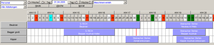 So könnte man den Terminplaner nutzen um die Maschinen übersichtlich zu planen. Dazu legen Sie die Maschinen als Personal an. Erstellen Sie den passenden Filter dazu. Im Anschluss daran geben Sie den zuvor angelegten Maschinen im Personalstamm ein Austrittsdatum. Dadurch erscheinen Sie dann in keiner Personalauswahl mehr. Im Terminplan sind sie dann schon durch den Filter zugeordnet. Auf diese Art kann man alle möglichen Dinge im Terminplaner verwalten.