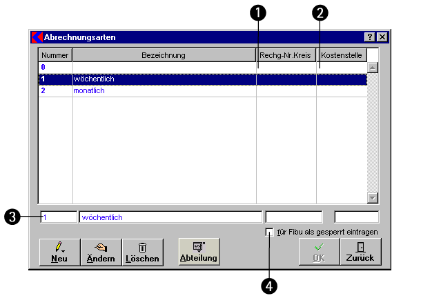 Die Liste im oberen Teil des Fensters zeigt alle vorhandenen Abrechnungsarten an.