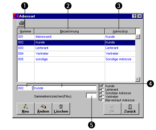 - Nummer für die Adressart. Die Nummer wird beim Anlegen einer neuen Adressart automatisch vergeben.