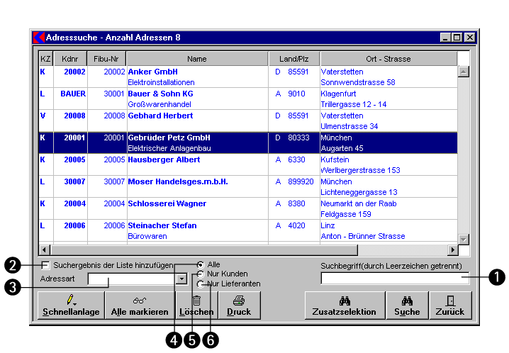 - · Starten Sie die Suche durch Klick auf die Schaltfläche Suche. Mit einem Doppelklick auf den Eintrag können Sie ihn in das Adressen-Fenster übernehmen. Zurück im Adressen-Fenster können Sie mit den Pfeilschaltflächen neben dem Symbol Liste in den Suchergebnissen auf- und abwärts blättern.