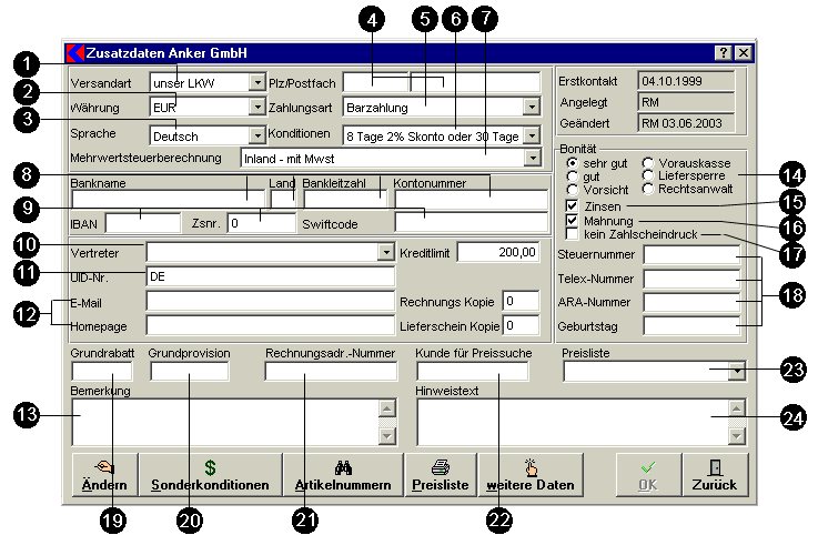 - Mit diesen Optionsschaltflächen können Sie die Kunden in verschiedene Bonitätsklassen einteilen. Bei fragwürdiger Bonität erscheint bei der Anlage eines neuen Verkaufsbelegs eine Warnmeldung.