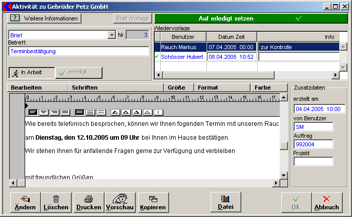 Diese Schaltfläche kommt nur wenn Sie aus der Wiedervorlageliste mit Doppelklick in die Aktivität verzweigen. Mit einem Klick auf diese Schaltfläche erledigen Sie Ihre Wiedervorlage.