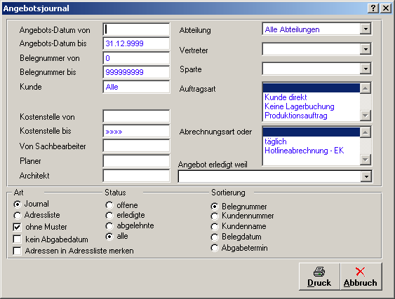 Journale geöffnet. Es dient dem Druck einer Auswahl von Angebotsbelegen.