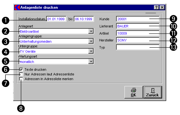Hier können Sie die Suchkriterien für den Ausdruck der Anlagenliste einstellen.