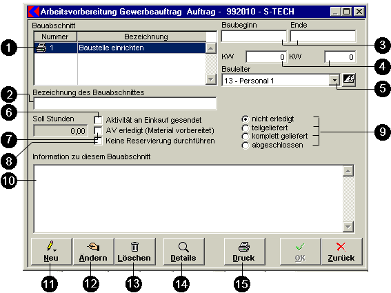 In diesem Fenster werden Bauabschnittsbezogen die Informationen eingegeben. Mit der Schaltfläche Details öffnet sich ein Fenster, wo das Material zu den selektierten Bauabschnitten für den Einkauf und den Arbeitsbeschreibungen vorbereitet wird. Siehe auch Arbeitsvorbereitung Details
