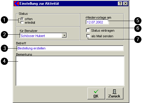 - Status der Aktivität: Hier können Sie die Option offen oder erledigt wählen.
