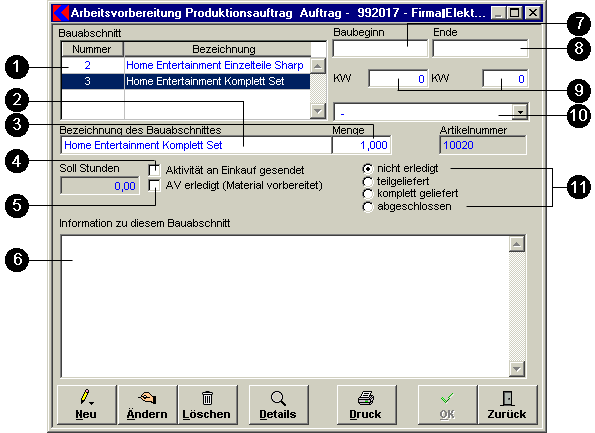 Mit der Arbeitsvorbereitung zur Produktion werden die einzelnen Stücklisten als Bauabschnitt unterteilt. Die einzelnen Stücklisten werden hier für die Produktion und den Materialbedarf vorbereitet.