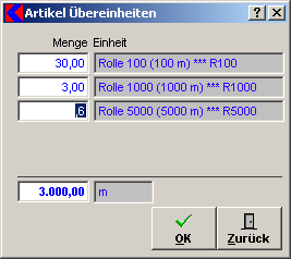 Mit dem *** R100, *** R1000 und *** R5000 erkennen Sie dass es eine Verbindung zu einem anderen Artikel gibt. Wenn Sie nun z.B. bei Rolle 1000 die Menge 3 eingeben und mit OK bestätigen, sucht Kplus nach dem Artikel mit der Bestellnummer R1000 und dem hinterlegten Lieferanten der Bestellung. Wenn solch ein Artikel gefunden wird dann rechnet Kplus den Eintrag aufgrund der Übereinheit um. In diesem Beispiel würde die Bestellposition mit der Liefermenge 3000 m und der Fakturamenge 3 rollen erstellt. Den Preis nimmt Kplus dabei auch aus dem verknüpften Artikel. Zusätzlich wird die Bestellnummer des verknüpften Artikels in das Feld Bestellnummer der Bestellposition übernommen. Wenn Sie diese Position nach dem Liefereingang auf den Auftrag buchen, wird die Fakturamenge von rolle wieder in m umgerechnet.