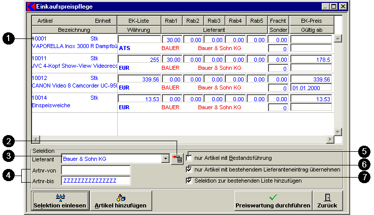 | Hinweis: | Die Selektion ist die Auswahl der Artikel, deren Einkaufspreise zu warten sind. |