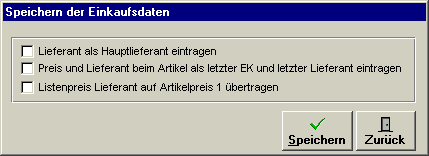- Klick Kontrollkästchen: Preis und Lieferant beim Artikel als letzter EK und letzter Lieferant eintragen.
