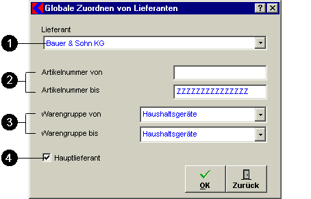 Die Zuordnung und Hinterlegung eines Lieferanten über eine Auswahl von Artikel oder Warengruppen.