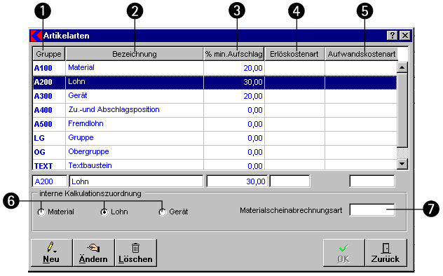 - Gruppe: Die Artikelarten A100, A200, A300, A400 und A500 sind schon vordefinierte Funktionen im Programm und ihre Kürzel dürfen nicht verändert werden. (Die Bezeichnung kann umbenannt werden.) Das Kürzel für eine Artikelart kann aus bis zu 4 Zeichen bestehen.