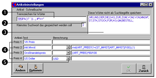 Hier können Sie generelle Festlegungen zur Artikelsuche und den Preisfeldern im Artikel-Fenster treffen.
