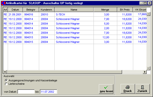 Die Artikelkartei ist eine Auflistung und Protokollierung des Artikels mit der Art des Verkaufsbeleges, Datums, Belegnummer, Kunden, Menge, Einkaufspreises und Verkaufspreises.