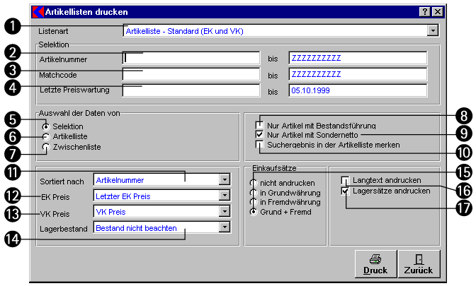 - Selektion laut Artikelliste: Druckt eine Liste aller Artikel, die als Suchergebnis bei der Artikelsuche gefunden wurden.