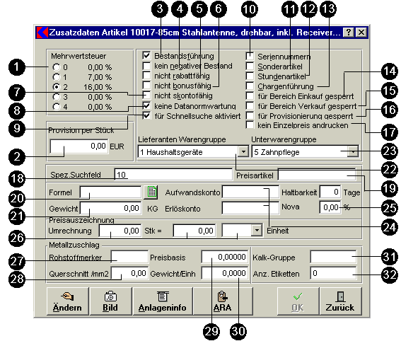 Das Fenster Zusatzdaten zu einem Artikel erreichen Sie, indem Sie auf das Symbol