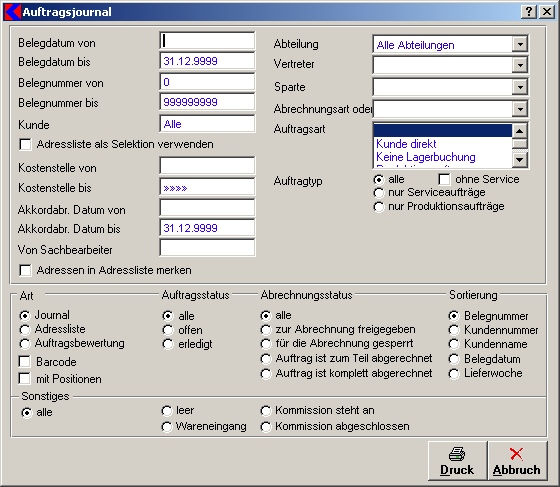 Journale geöffnet. Es dient dem Druck einer Auswahl von Aufträgen.