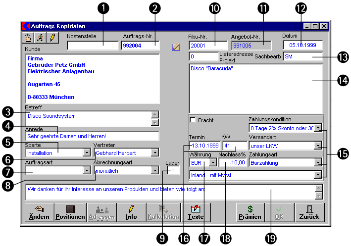- Bestimmen Sie hier, in welcher Währung (z.B. DM, ATS, ...) der Auftrag berechnet werden soll. Der Vorschlag kommt aus dem Adressenstamm.
