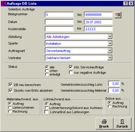 Diese Auswertung besteht aus verschiedenen Selektionskriterien nach deren die Aufträge ermittelt werden können: