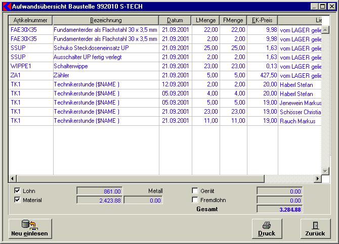 Die Aufwandsübersicht ist mit Klick auf Kontrollkästchen Lohn, Material, Gerät und Fremdlohn auszuwählen und mit der Schaltfläche Neu einlesen wird nach den ausgewählten Kontrollkästchen die Liste gefüllt. Die Summen werden in die Eingabefelder neben den ausgewählten Bereichen geladen.