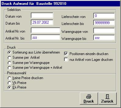 Kontrollkästchen Artikel vom Lager drucken. Es werden nur Artikel die vom Lager geliefert worden sind gedruckt.