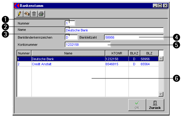 In diesem Fenster tragen Sie alle Bankverbindungen ein, die Ihre Firma unterhält.