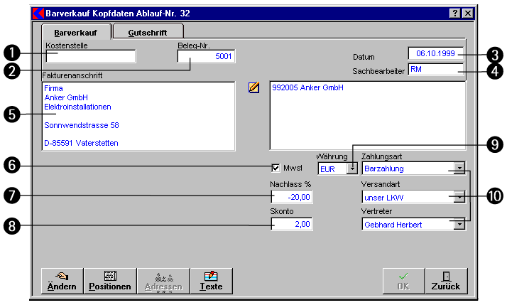- Hier können Sie die vorgegebenen Einstellungen für Zahlungsarten, Versandart den Vertreter des Kunden speziell für diesen Beleg ändern.