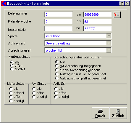 Die Bauabschnittsterminliste ist eine Übersicht mit Aufträgen, die nach Bauabschnitten, Woche laut Selektionen aufgelistet werden.