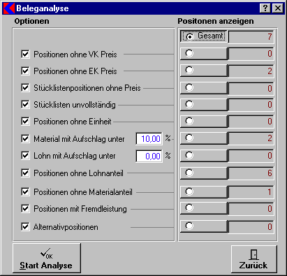 - Mit den Schaltflächen Positionen anzeigen werden gezielt die Positionen eines Belegs im Fenster Positionen zu einem Beleg angezeigt, die vorher mit den Parametern unter Optionen ausgesucht wurden. So werden z.B. nur Positionen ohne VK Preis gezeigt, wenn die Option vor dem Start der Analyse ausgewählt worden ist und die Schaltfläche unter Positionen anzeigen betätigt wurde. Rechts neben den Schaltflächen für die Positionen wird die Anzahl der gefundenen Positionen aufgezeigt. Es kann nur immer eine Schaltfläche betätigt werden. Mit der Schaltfläche Gesamt wird nach Ablauf der Analyse die Gesamtzahl der Positionen in einem Beleg angegeben und nach Betätigung alle Positionen wieder angezeigt.