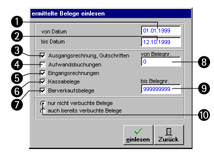 - Schaltfläche Start: Klicken Sie auf diese Schaltfläche, um das Einlesen der bereits ermittelten Belege zu starten.