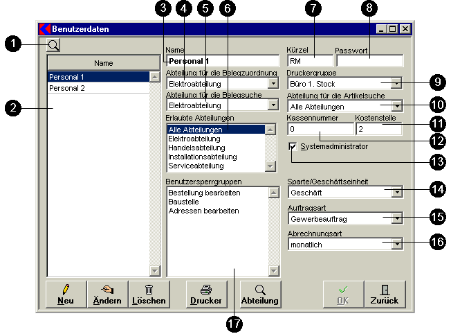 - Die Liste Name zeigt alle angelegten Benutzer an. Für den markierten Benutzer werden in den übrigen Feldern die aktuellen Daten angezeigt.