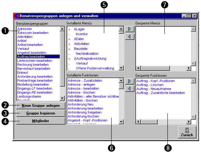 - Die Auswahlliste Gesperrte Menüs zeigt an, welche Menügruppen für die aktuelle Benutzersperrgruppe gesperrt sind. Diese Fenster sind für die Gruppenmitglieder nicht aufrufbar. Mit Klick auf die Zuweisungsschalter oder mit der ENTFERNEN-Taste können Sie die Sperrung eines ausgewählten Eintrags aufheben, der Eintrag erscheint dann wieder in der Liste Installierte Menüs.