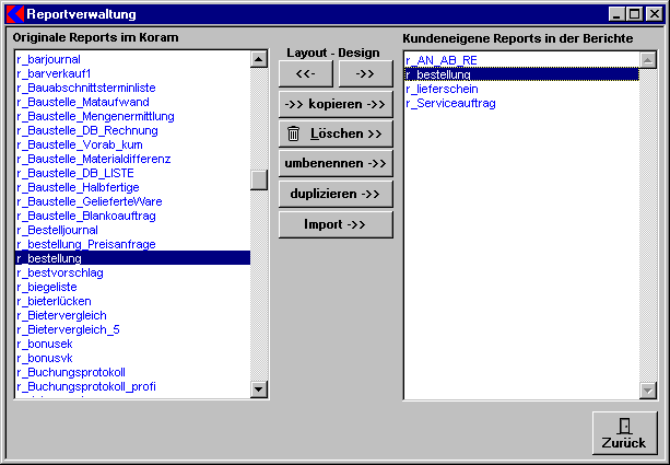 In dieses Fenster gelangen Sie über die Schaltfläche Berichtverwaltung im Fenster Formulare Verwaltung.