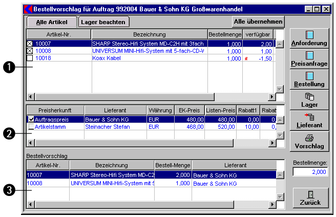 Dieses Fenster ist in die drei Listen Artikelvorschlag (obere Liste), mögliche Lieferanten zu einem Artikel und Bestellpositionen geteilt.