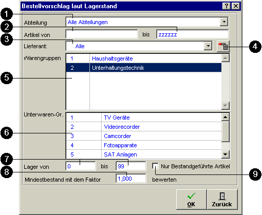 Dieser Bestellvorschlag wird aus dem Lagerstand durch die hinterlegten Werte der Reservierung, Minusbestände und Mindestbestände ermittelt. Diese Vorschläge können laut den selektierten Punkten 1 bis 7 ausgewertet werden.