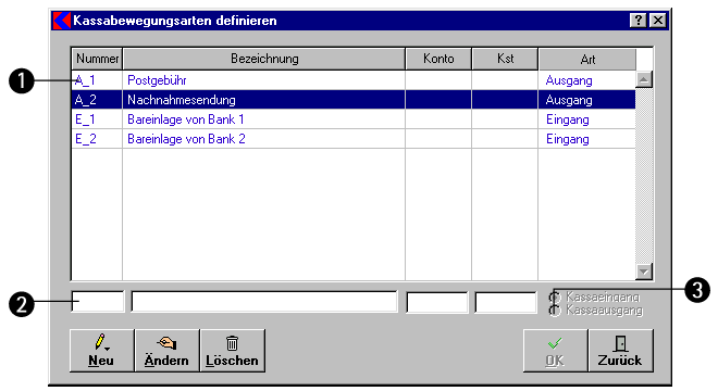 - Liste: "Kplus" bietet Ihnen standardmäßig die Bewegungsarten Postgebühr und Nachnahmesendung. Die weiteren von Ihnen benötigten Arten können Sie unter Neu selbst anlegen. Die Bewegungsarten aus dieser Liste stehen Ihnen beim Buchen des Kassenein- und -ausgangs zur Verfügung. Siehe Kasseneingang buchen und Kassenausgang buchen.