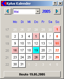 - Hier werden die Tage im Kalenderformat und einzelenen Schaltflächen dargestellt. Die Sonntage im Monat werden in anderer Farbe und die freien Tage mit einem Raster zusätzlich dargestellt. Mit Klick auf einen Tag wird dieser in das Datumsfeld des jeweiligen Fensters übernommen.
