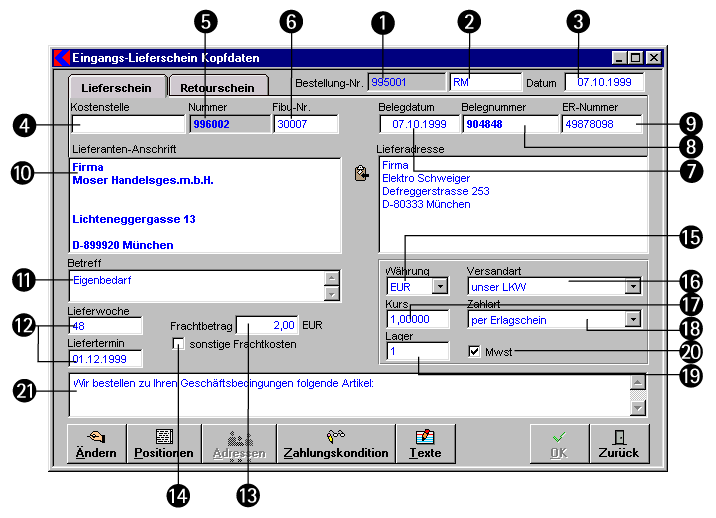 - Die Bestellung-Nr. wird automatisch angezeigt, wenn dieser Lieferschein aus einer Bestellung übernommen wurde.