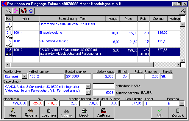 Eingangsrechnung öffnet sich das Fenster Positionen Eingangs-Faktura mit den Daten zum markierten Beleg.