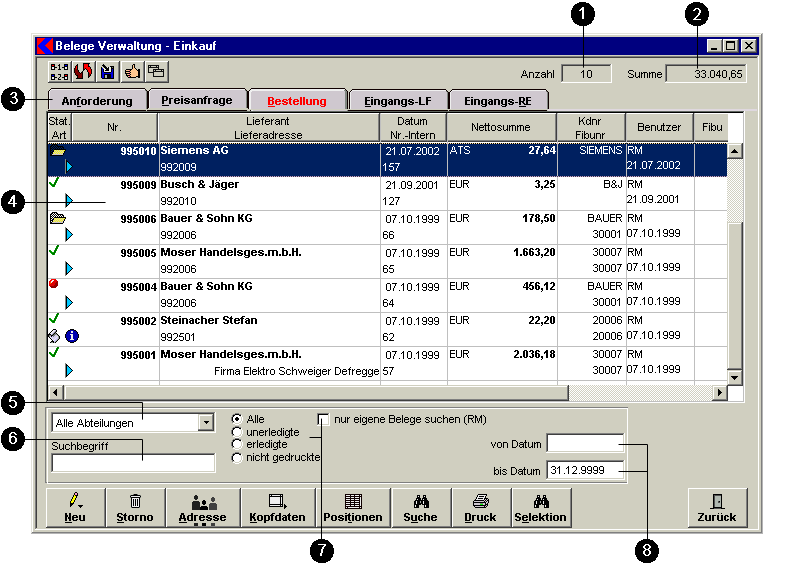 Als Grundlage für die Arbeit im Bereich Einkauf-Belegeverwaltung wird hier das Fenster Belege Verwaltung - Einkauf allgemein beschrieben. Auf dieses Fenster wird in den Bereichen Anforderung, Preisanfrage, Bestellung, Eingangs-Lieferschein und Eingangs-Rechnung nur noch verwiesen. Falls einige spezielle Funktionen in diesen Bereichen auftauchen, werden diese dort erläutert.