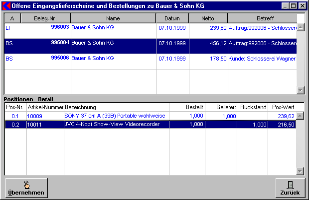 Wenn die Daten bereits im Bereich Bestellung oder Eingangs-LF erfaßt wurden stehen sie nun schon zur Verfügung. Markieren Sie den zu bearbeitenden Beleg und klicken Sie auf die dem Bearbeitungswunsch zugehörige Schaltfläche.