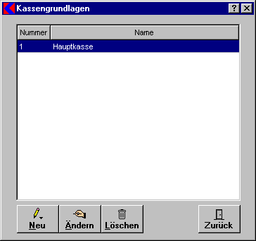 - Schaltfläche Neu: Klicken Sie auf diese Schaltfläche, um eine neue Kasse einzutragen. Sie gelangen in das Fenster Kassengrundlagen für Kasse, in dem Sie alle grundlegenden Einstellungen für diese Kasse vornehmen.