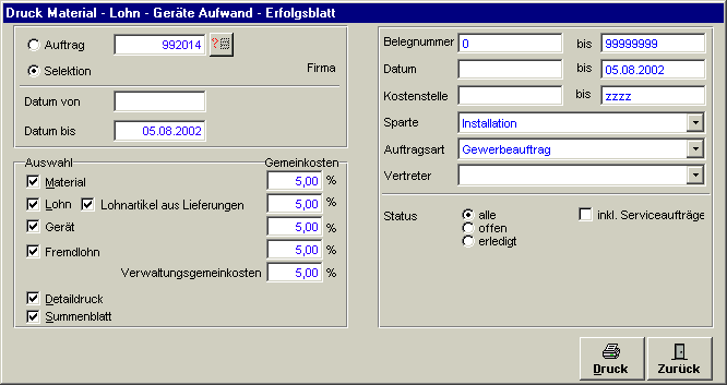 Bei Auswahl des Kontrollkästchens Detaildruck wird eine Aufwandsübersicht der gewählten Aufträge erstellt.