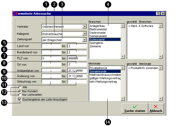 In dieses Fenster gelangen Sie, wenn Sie im Adresssuchfenster auf die Schaltfläche Zusatzselektion klicken.