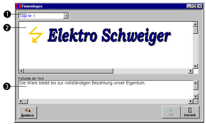 Das Fenster zur Verwaltung von Firmenlogos und Fußzeilen finden Sie unter Datei