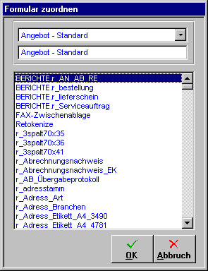 Hier wählen Sie aus der oberen Auswahlliste die Art des neuen Formulars, z.B. Angebot - Standard. Vergeben Sie im Feld darunter einen Namen für das neue Formular. In der unteren Liste können Sie das ensprechende Formular zuordnen. Schließen Sie die Neuanlage mit Klick auf OK ab.