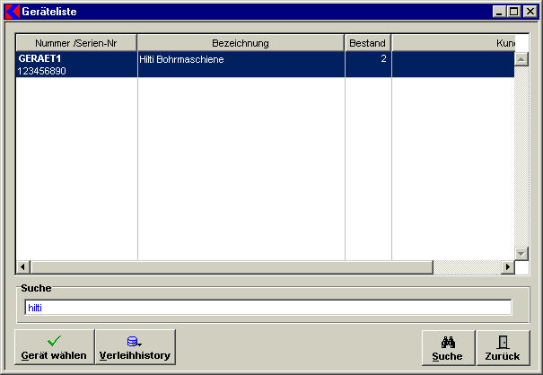 Dieses Fenster wird benötigt, um die Geräte auszuwählen und mit der Schaltfläche Gerät wählen für die Retournahme in den Verleih zu übernehmen.