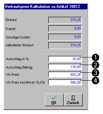 Wenn Sie Ihre Eingabe mit Klick auf OK bestätigen, wird der hier kalkulierte Netto-Preis in das Artikel-Fenster übernommen.